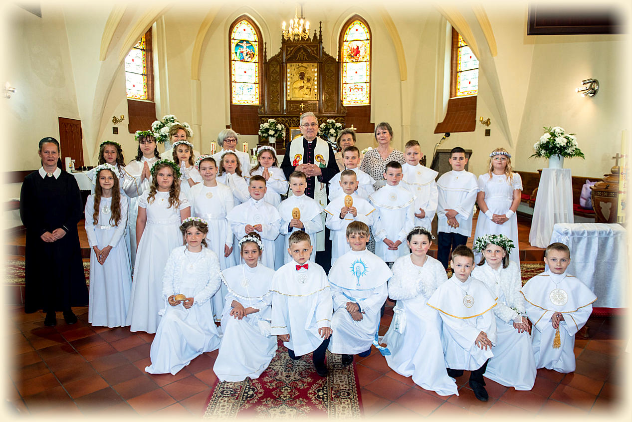 ,,Pierwsza Komunia święta jest wielkim świętem w naszej parafii. Zawsze tak było w naszej polskiej tradycji, która od tysiąca lat  ukształtowała się na tej ziemi jako tradycja chrześcijańska.  Rodzina zawsze była i nadal pozostaje tym ludzkim środowiskiem,  pierwszym i podstawowym, do którego Bóg przychodzi przez  wielkie sakramenty naszej wiary, poczynając od chrztu świętego.  Rodzice, którzy dają ludzkie życie swoim dzieciom tu, na ziemi,  zapraszają do ich serc Dawcę życia wiecznego”.                                                                                     Św. Jan Paweł II, Łódź, 13 czerwca 1987  Każdego roku w kościele parafialnym w Duninowie, w niedziele poprzedzającą Uroczystość Najświętszego Ciała i Krwi Chrystusa  odbywa się Pierwsza Komunia Święta. Do tego dnia dzieci przygotowują się wraz z rodzicami poprzez katechezę szkolną i spotkania  formacyjne. To wielka radość dla całej naszej wspólnoty parafialnej, że kolejna grupa dzieci będzie mogła w pełni uczestniczyć w  Eucharystii, karmiąc się Ciałem Chrystusa. Wszystkim dzieciom jak i rodzicom gratulujemy tego wydarzenia i  życzymy by ono jeszcze głębiej umacniało ich w miłości do Chrystusa obecnego w Eucharystii.  Sakrament Pierwszej Komunii Świętej     04.06.2023r. Nikola Bielecka Kamil Domagała Natan Duszyński Marcel Godzieba Gabriel Jaskólski Patryk Kilian Zuzanna Kluczny Alan Konkol Lena Lewicz Alex Maciejewski Zofia Małkowska Alina Mykhailovska Wiktoria Olejnik MIłosz Sieradzki Kornelia Stefańczyk Liliana Wyłupek Znajdek Zuzanna Wiktoria Czechowska Marcel Grzegorzewicz Oliwia Kowalska Denis Kozina Filip Lewandowski Olga Mikołajczak Laura Pruss Duszpasterze Msze św Nabożeństwa Sakramenty- wytyczne Dokumenty Pierwsza Komunia Święta Sakrament Bierzmowania Prace remontowo budowlane Publiczne Szkolne  Schronisko Młodzieżowe w Duninowie